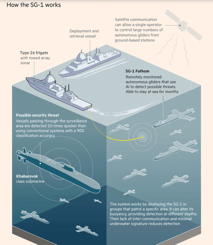 В основе концепции — и первый элемент, который будет развернут в море в начале следующего года, — лежит Atlantic Net: сеть датчиков, использующая флотилии автономных подводных глайдеров для обнаружения, классификации и отслеживания вражеских подводных лодок.