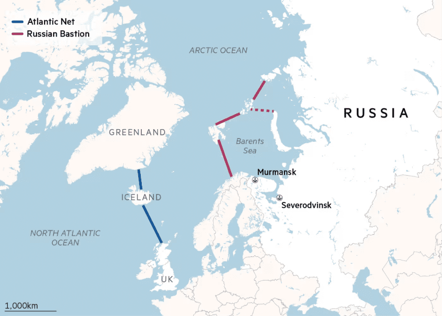 По словам источника, знакомого с проектом Atlantic Net, система будет сосредоточена на разрыве Гренландия–Исландия–Великобритания (GIUK) — морском узком проходе, который уже почти столетие служит первой линией обороны Великобритании в Северной Атлантике.