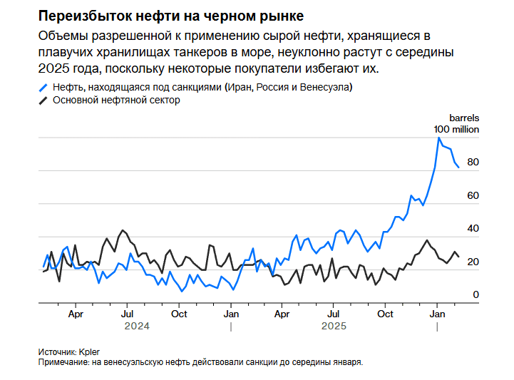 Точный масштаб избытка на черном рынке определить сложно. По моей оценке, запасы — распределенные между наземными резервуарами и нефтяными танкерами, используемыми как временные плавучие хранилища, — превышают 100 миллионов баррелей. По текущим ценам, даже с учетом скидок на санкционную нефть, их стоимость составляет не менее 5 миллиардов долларов. Компания Kpler, занимающаяся аналитикой сырьевых рынков, оценивает объем российской и иранской нефти, находящейся исключительно в плавучем хранении, в 58 миллионов баррелей. В начале прошлого года этот показатель составлял всего 6 миллионов.