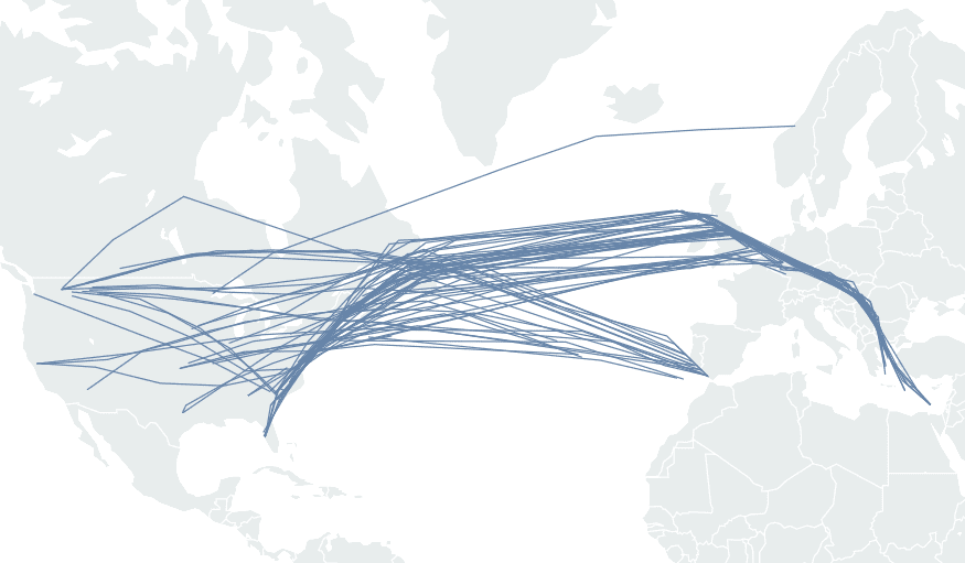 Количество рейсов американских самолетов-заправщиков и тяжелых транспортных самолетов в Европу за последние 3 дня. Источник: FlightRadar24, FT analysis via The Financial Times