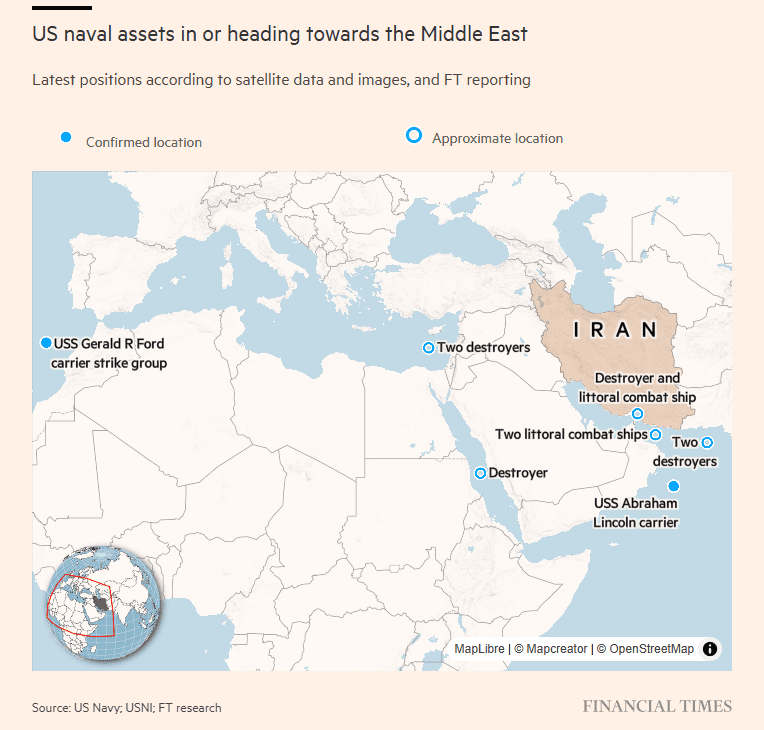 Анализ FT недавних спутниковых снимков подтвердил позиции авианосца USS Lincoln у побережья Омана. В среду днём у западного побережья Африки был зафиксирован сигнал AIS-трекинга от авианосной ударной группы USS Gerald R Ford.