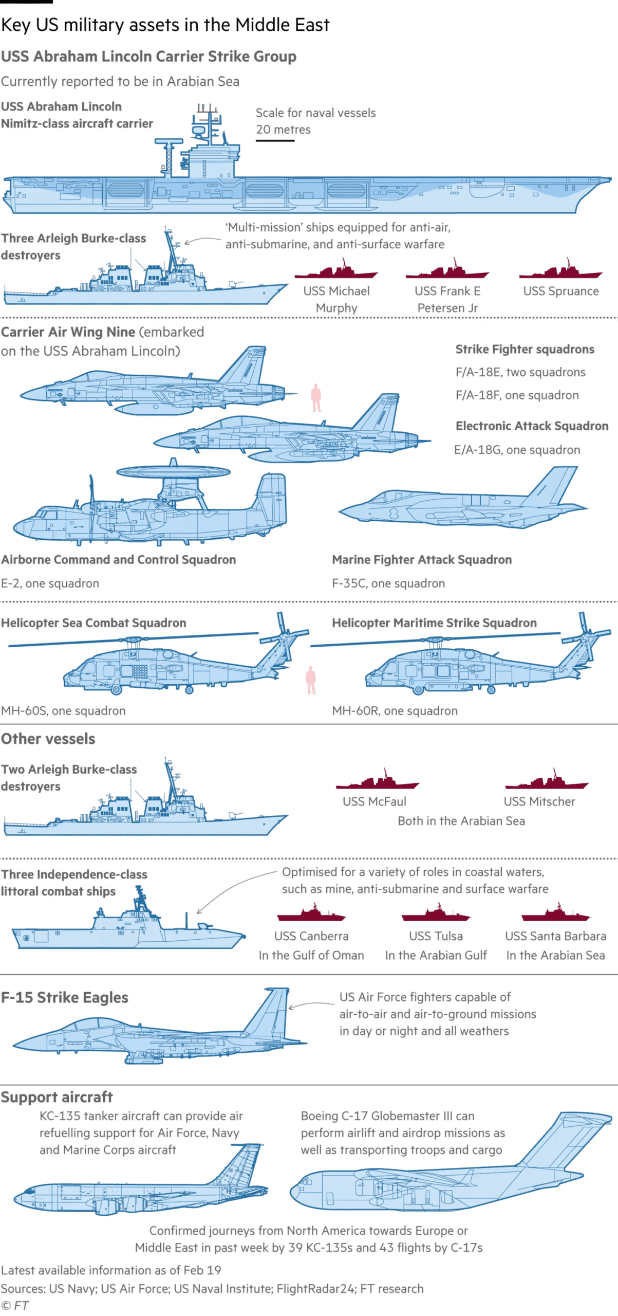 По данным ВМС США, у Соединённых Штатов в регионе находится как минимум дюжина кораблей, включая авианосец и восемь эсминцев, а также три прибрежных боевых корабля (littoral combat ships), переоборудованных в тральщики.