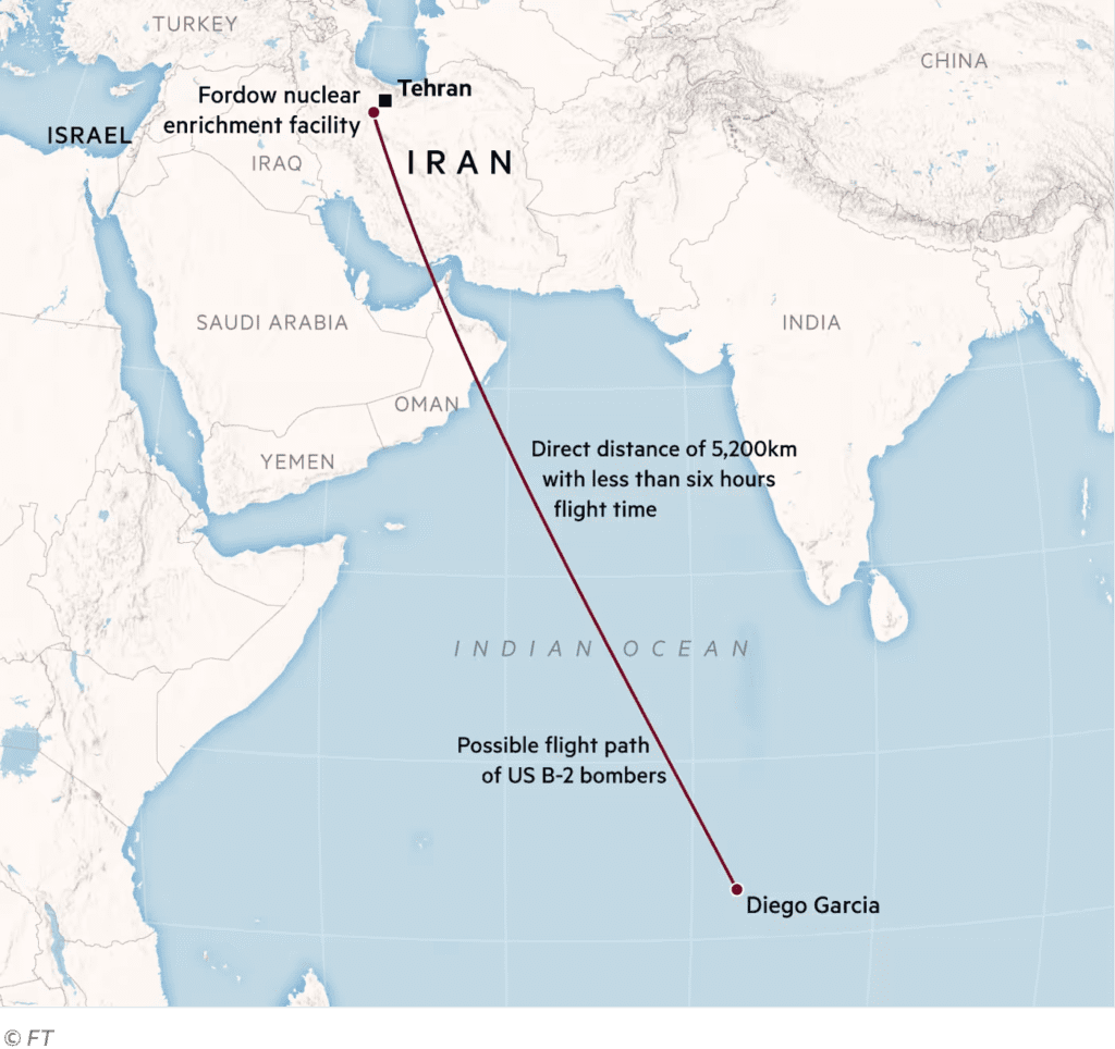 Трамп заявил, что потенциально может использовать совместную базу США и Великобритании на Диего-Гарсия — примерно в 5200 км от Тегерана — для запуска атак, однако Лондон, как было обозначено, относится к этому без энтузиазма.