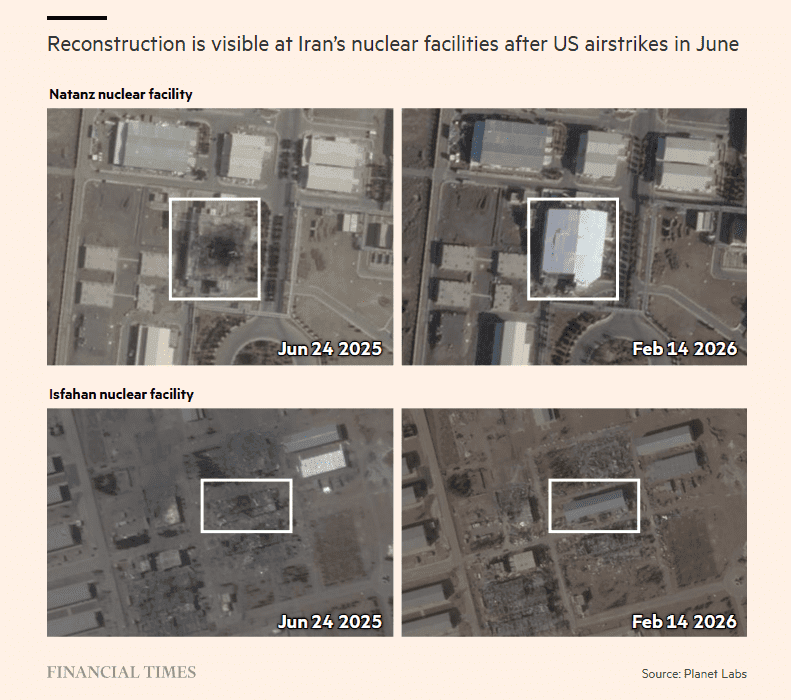 Ядерные объекты в Натанзе и Исфахане, по которым США наносили удары в прошлом году, получили серьёзные повреждения нескольких зданий. Последние спутниковые изображения показывают, что на обоих объектах ведутся восстановительные работы.