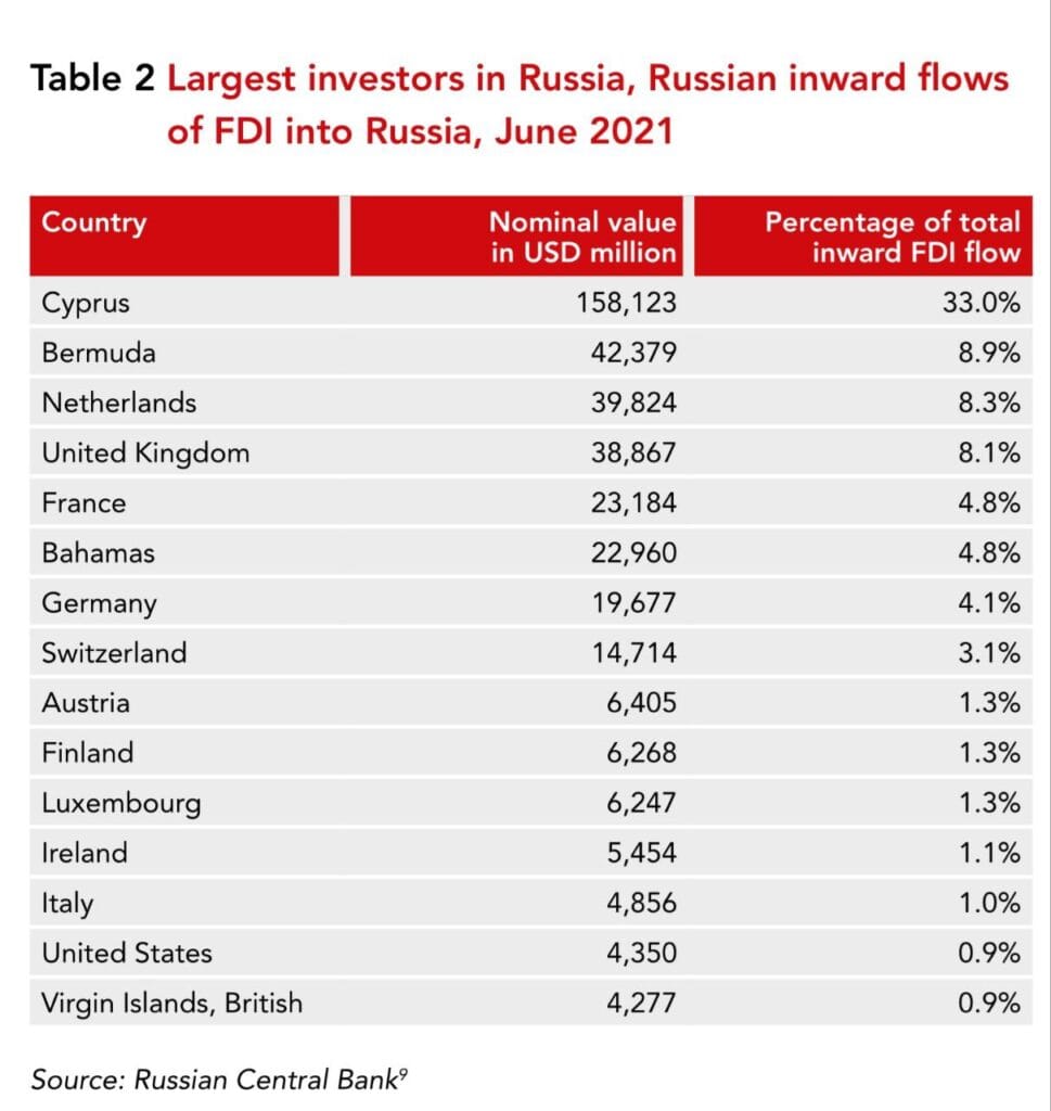 Vor 2022 waren die offiziellen Statistiken zu Direktinvestitionen erheblich verzerrt, da europäische Jurisdiktionen in großem Umfang als Durchleitungsstationen für russisches Kapital dienten. Schätzungen zufolge hatten 70 bis 80 Prozent der über Zypern geführten Investitionen letztlich russische Eigentümer. Die Niederlande fungierten als rechtlicher Sitz für Konzerne wie X5, Yandex und VimpelCom, während Malta, Luxemburg, Irland und das Vereinigte Königreich häufig für Holding- und Finanzierungsstrukturen genutzt wurden.