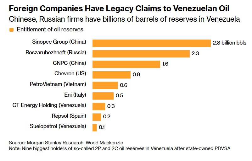 According to Bloomberg’s assessment, foreign state-owned companies — above all from China and Russia — now appear to be among the most exposed if Venezuela’s oil agreements are revised or rewritten.