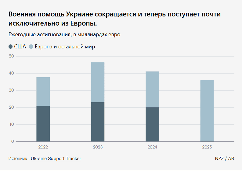 Поскольку США прекратили бесплатные поставки оружия Украине, западная военная помощь в 2025 году снизилась до самого низкого уровня с начала войны. Это следует из статистики, которую ведёт Кильский институт мировой экономики. В целом снижение по сравнению с предыдущим годом составило 12 процентов — меньше, чем опасались. Это произошло потому, что европейские страны увеличили свою поддержку и частично компенсировали выпадение США.