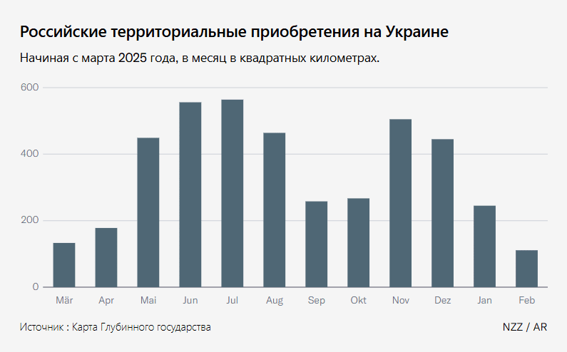 В целом за четвёртый год войны Россия установила контроль примерно над 4200 квадратными километрами. Это немного больше, чем в 2024 году, но всё равно лишь один процент оставшейся украинской территории. Каким образом Кремль намерен достичь своей стратегической цели — доминирования над соседней страной, — становится всё менее очевидно. Даже для достижения минимальной цели полного захвата Донбасса при нынешних темпах России потребовалось бы более двух лет.
