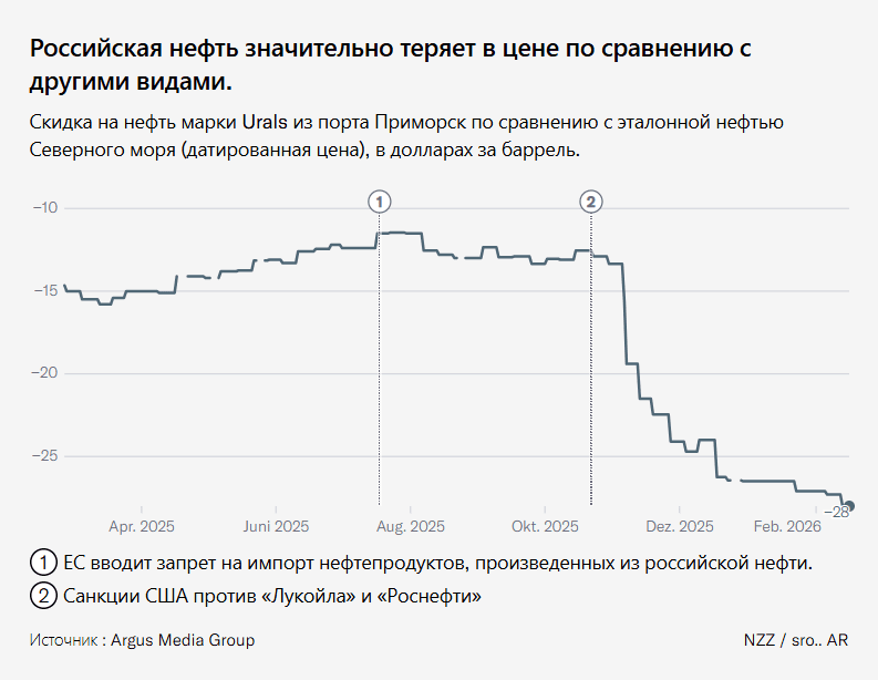 Предварительные данные указывают на то, что российское государство в первые два месяца 2026 года получило от нефтегазового сектора лишь вдвое меньше доходов, чем годом ранее. Это существенно, поскольку на этот сектор приходится около четверти государственных доходов.