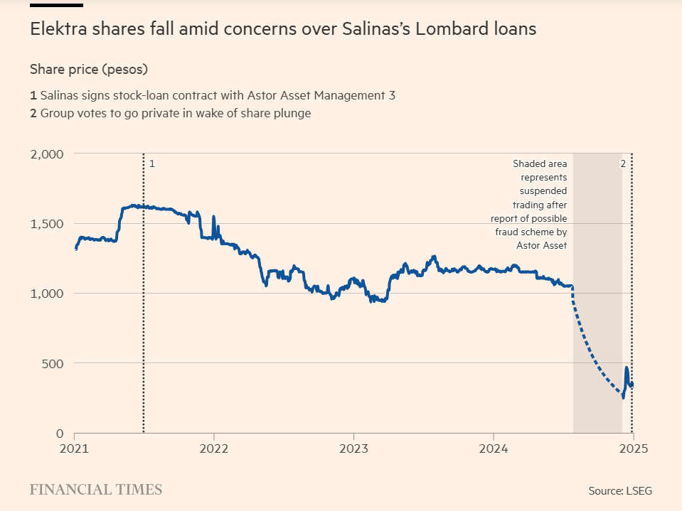 В данном случае акции не были просто удержаны в качестве обеспечения до возврата займа — их продали, а выручку использовали для финансирования самого кредита и обогащения кредиторов. Салинас утверждает, что ему понадобилось более трёх лет, чтобы понять, что произошло. Когда информация стала публичной, акции Elektra резко упали и были приостановлены в торгах.