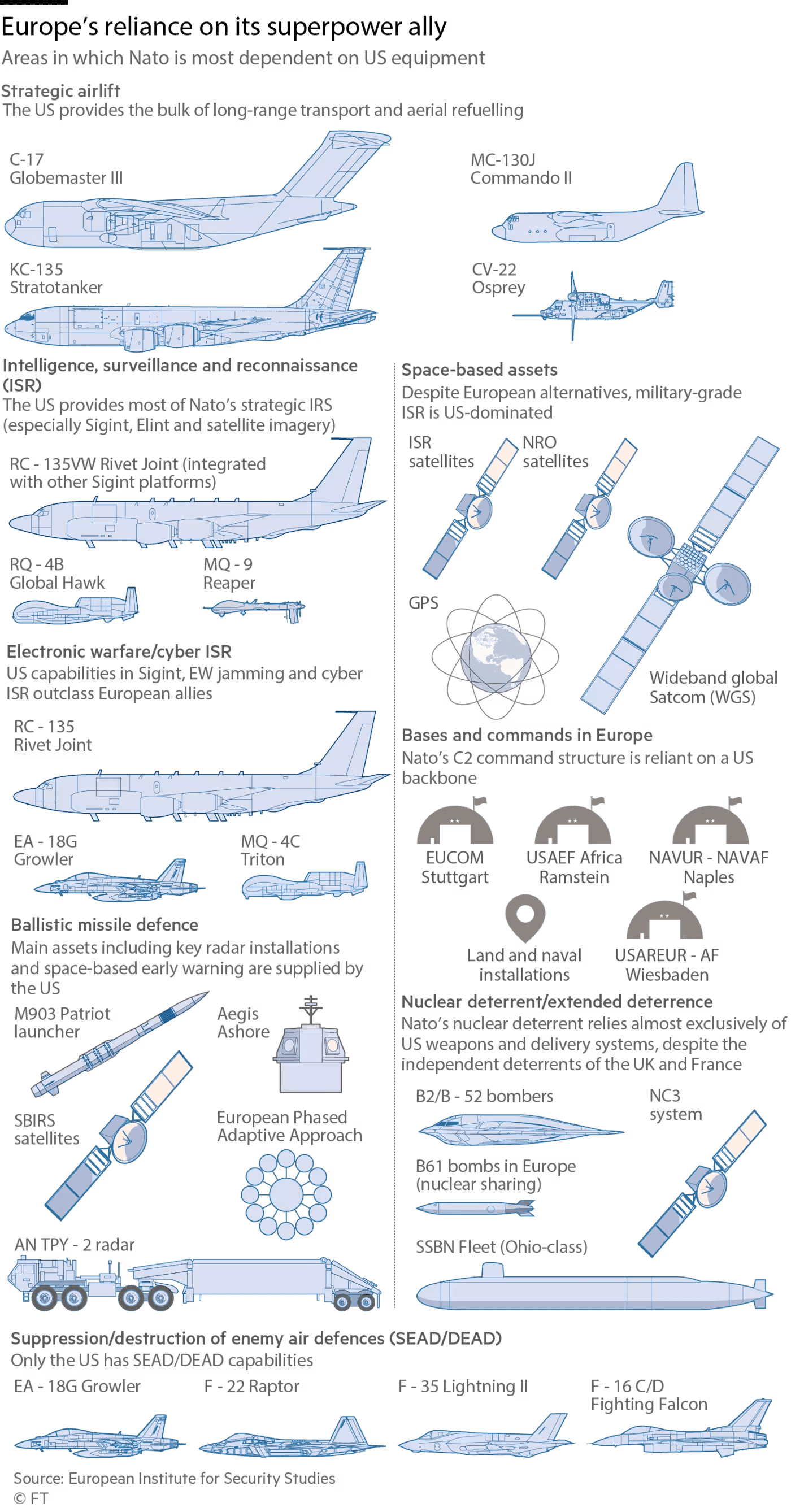 Альянс в огромной степени зависит от США в ряде ключевых областей, прежде всего: разведка, наблюдение и рекогносцировка; боевые коммуникации и облачные вычисления; противовоздушная оборона; тяжёлая транспортная авиация; подавление систем ПВО противника. Европейские члены НАТО также испытывают дефицит дальнобойных высокоточных ударных ракет.