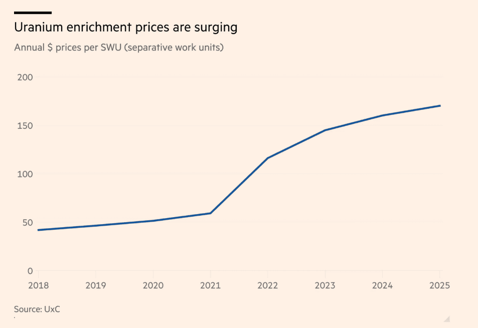 Эксперты предупреждают, что дефицит услуг по обогащению может сорвать стратегию президента Дональда Трампа по «высвобождению следующего ядерного возрождения Америки». По данным поставщика отраслевой информации UxC, цены выросли на 167% с момента начала войны России и Украины в феврале 2022 года — до рекордных $173 за единицу разделительной работы (SWU), показателя, используемого для измерения услуг по обогащению.