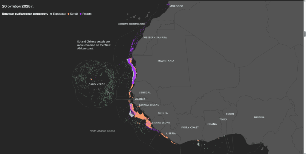 Сегодня данные отслеживания судов показывают сотни кораблей у побережья Западной Африки — многие из Китая и Европы, часто субсидируемые.