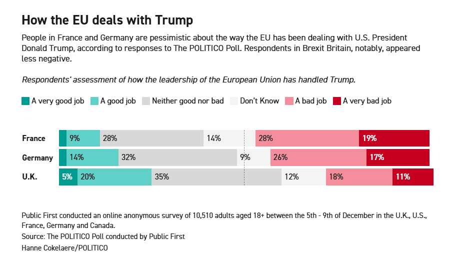 Онлайн-исследование, проведённое независимой лондонской компанией Public First, также показало, что многие европейцы разделяют критическую оценку Трампа, данную им в интервью POLITICO ранее на этой неделе, относительно слабости собственных национальных лидеров. В опросе приняли участие более 10 000 респондентов из США, Канады и трёх крупнейших экономик Европы: Германии, Франции и Великобритании.