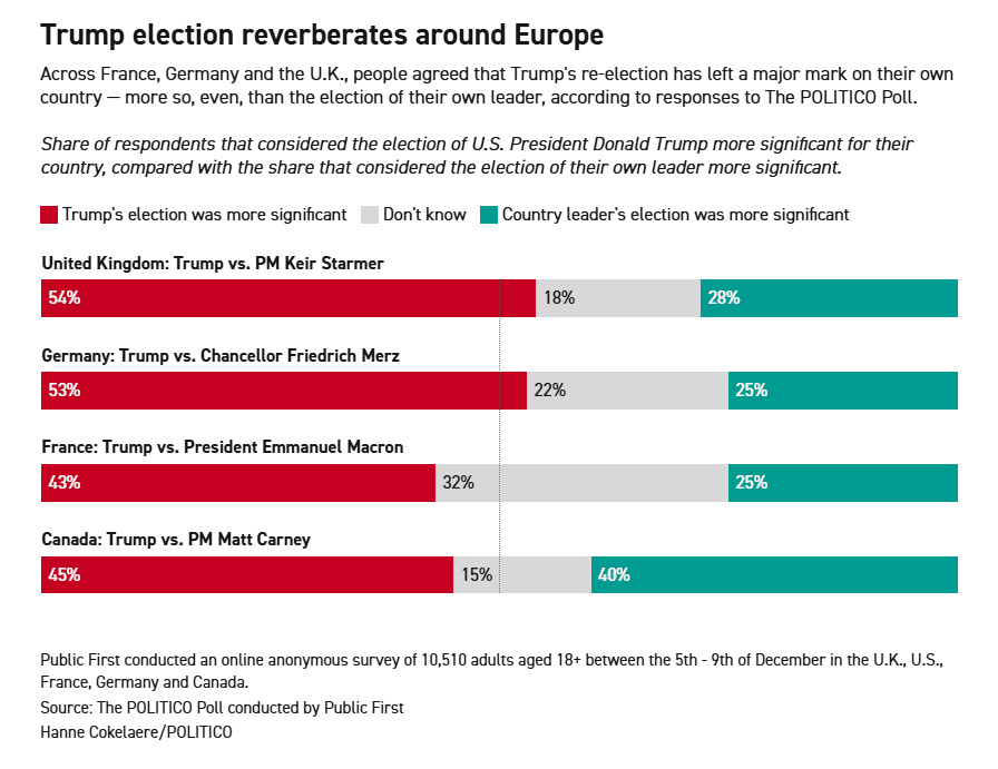 Возвращение Трампа на пост президента США оказалось куда более значимым для избирателей в Германии, Франции и Великобритании, чем выборы собственных национальных лидеров, согласно результатам первого международного опроса POLITICO.