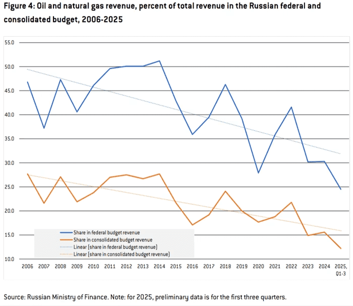 «В 2024 году [налоги на углеводородную ренту] составили 30,3 процента доходов федерального бюджета и 15,6 процента доходов консолидированного бюджета. Согласно предварительным данным за первые три квартала 2025 года, эти доли снизились соответственно до 24,5 процента и 12,2 процента.