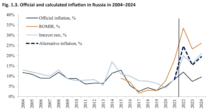 И вновь подчеркну: всё это основано на публичных и официальных данных. Если даже они выглядят столь мрачно, можно лишь представить, какова реальная ситуация. Доклад PeaceRep подробно останавливается на этом, утверждая, что официальная инфляция занижена. Вероятно, это так — но на сколько? Авторы используют докризисные (до 2022 года) взаимосвязи между официальной инфляцией, альтернативными ценовыми индексами и решениями центрального банка по процентным ставкам, чтобы оценить реальный уровень инфляции, и приходят к выводу, что он примерно вдвое выше официального.