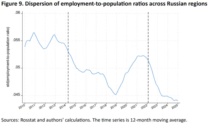 Однако после первой агрессии Путина против Украины в 2014 году это сближение полностью застопорилось — по мнению авторов, из-за санкций, которые осложнили доступ к иностранному капиталу и технологиям, снизив эффективность экономики. После же полномасштабного вторжения в 2022 году сжатие заработных плат между регионами возобновилось. Наиболее естественная интерпретация заключается в том, что военная экономика усилила давление на зарплаты в регионах со средним уровнем доходов (где непропорционально сосредоточена военная промышленность) и в бедных регионах (которые непропорционально поставляют солдат). Это подтверждается и тем, что уровни занятости сходились аналогичным образом.