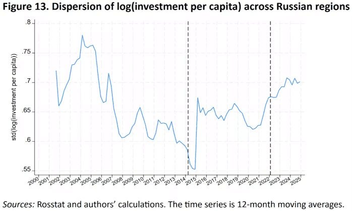 Однако примечательно, что подобного сближения не наблюдается в инвестициях между богатыми и бедными регионами России — скорее даже наоборот. Иными словами, военная экономика могла обеспечить сильный «экстенсивный» рост, то есть рост за счёт полного вовлечения ранее недоиспользованных капитала и труда, но не «интенсивный» рост, основанный на устойчивом повышении производительности. Следовательно, ни рост, ни конвергенция не могут продолжаться на прежней основе: экстенсивный рост рано или поздно исчерпывает доступные ресурсы.