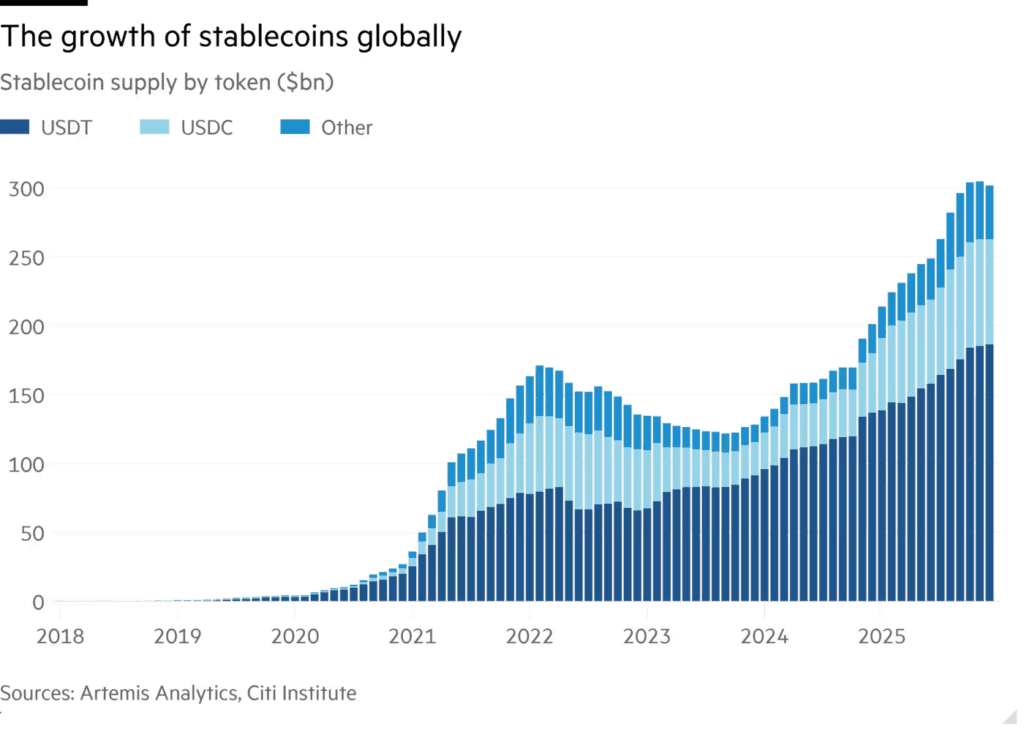 В центре этих усилий находятся стейблкоины — разновидность цифровых денег, жёстко привязанных в соотношении один к одному к таким валютам, как доллар, — и их всё более заметная роль в финансовой системе.