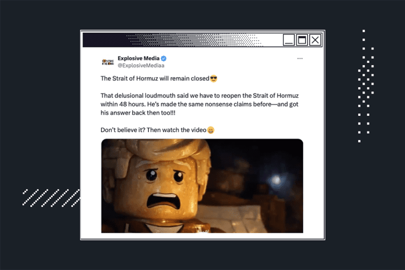 И, наконец, видео с Lego. Созданные группой Explosive Media, эти ролики с использованием ИИ изображают Трампа, Хегсета, а также американские и иранские вооружённые силы в виде жёлтых фигурок популярного конструктора. В одном видео Трамп лежит в постели и пишет в Truth Social, что весь военный флот Ирана полностью уничтожен. Иранский морской командир читает сообщение и смеётся, после чего начинает уничтожать корабли ВМС США в Ормузском проливе с помощью мин, ракет и беспилотников, пока Трамп, оставаясь в постели, начинает нервничать, представляя рост цен на бензин.