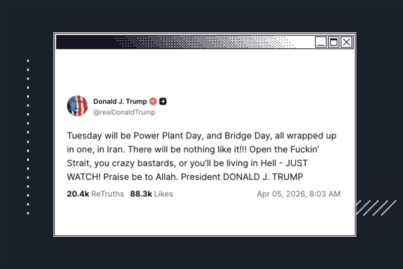 В воскресенье, 5 апреля, президент США Дональд Трамп напомнил о своём трижды отложенном дедлайне для Ирана — открыть Ормузский пролив или столкнуться с ударами США по гражданской инфраструктуре, такой как электростанции и мосты. Два дня спустя он усилил угрозу, заявив, что «вся цивилизация» Ирана «умрёт сегодня ночью», за несколько часов до того, как неожиданно объявил о двухнедельном перемирии.