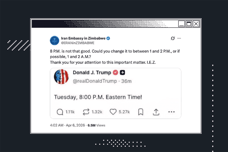Одним из самых неожиданных ответов на этот пост стал комментарий с аккаунта посольства Ирана в Зимбабве в X. «20:00 — не очень удачное время. Не могли бы вы изменить его на период с 13:00 до 14:00, или, если возможно, с 1:00 до 2:00 ночи? Спасибо за внимание к этому важному вопросу. И.Э.З.», — написало посольство, перефразировав в последнем предложении типичную формулу, которой Трамп часто завершает свои сообщения.