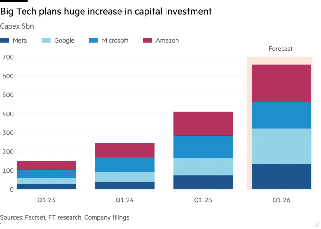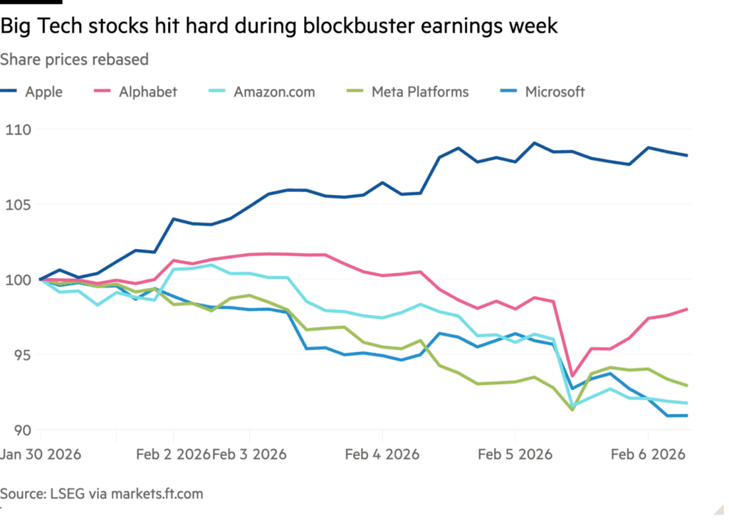 Акции крупнейших технологических компаний резко снизились после того, как они обнародовали планы потратить в этом году $660 млрд на искусственный интеллект. Инвесторы опасаются, что «захватывающие дух» капитальные расходы опережают потенциал заработков новой технологии.